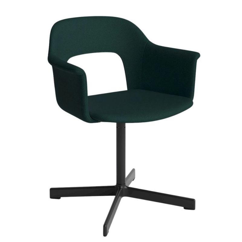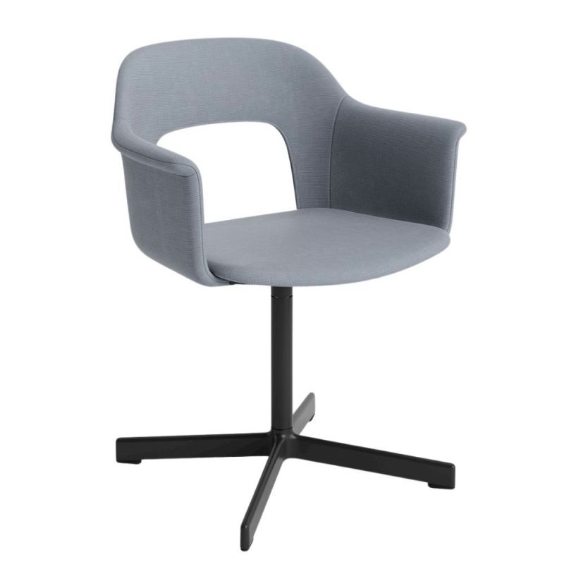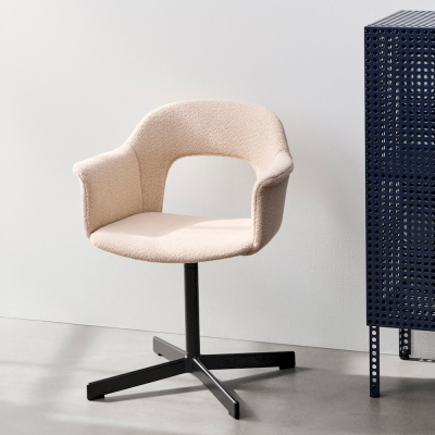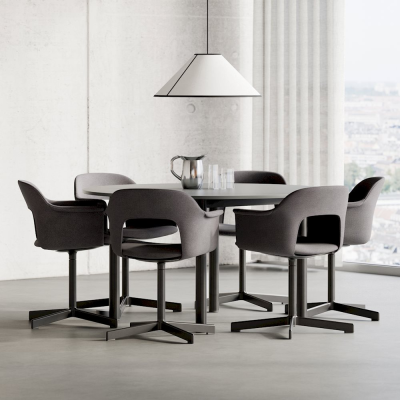 Layout Armchair 234, designet af Julien Renault med fokus på komfort, funktionalitet og bæredygtighed. Polstret sæde og ryg, karakteristisk åbning i ryglænet og drejefod med fire ben for stabilitet og bevægelighed. Skal i min. 96% genanvendt plastik og base i aluminium. Alle dele kan adskilles for lang levetid. Fås i flere tekstiler og olivenbladgarvet læder.