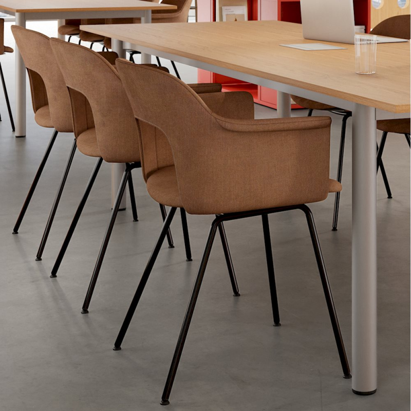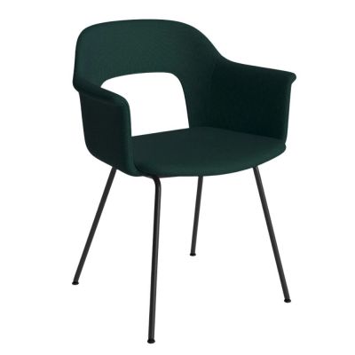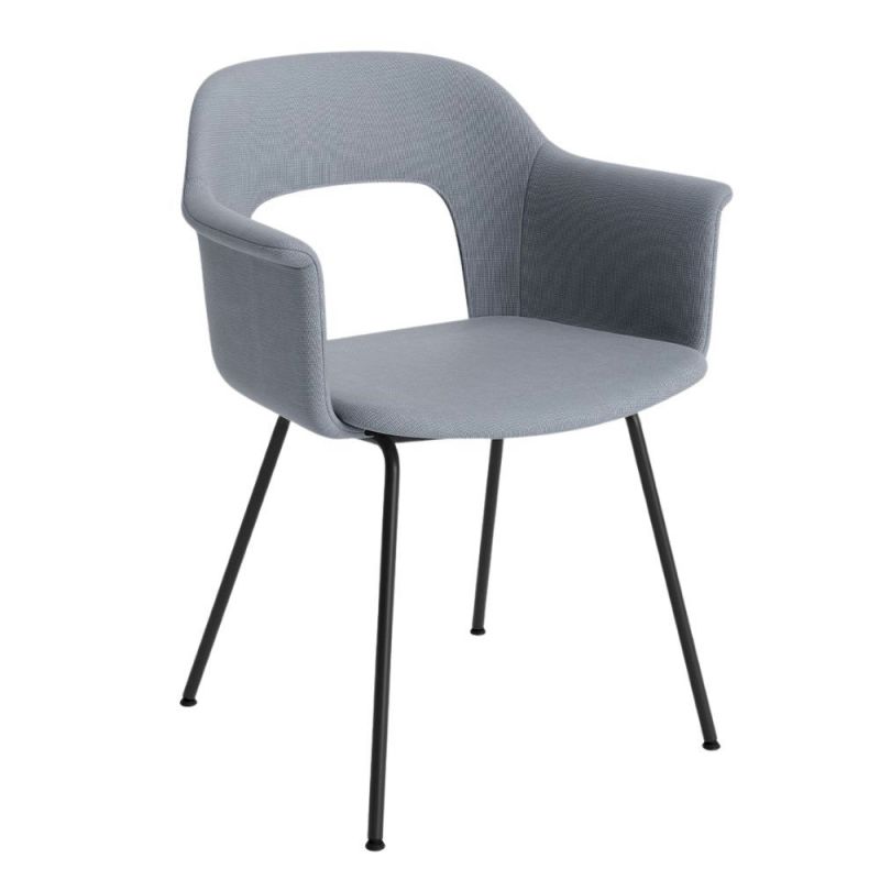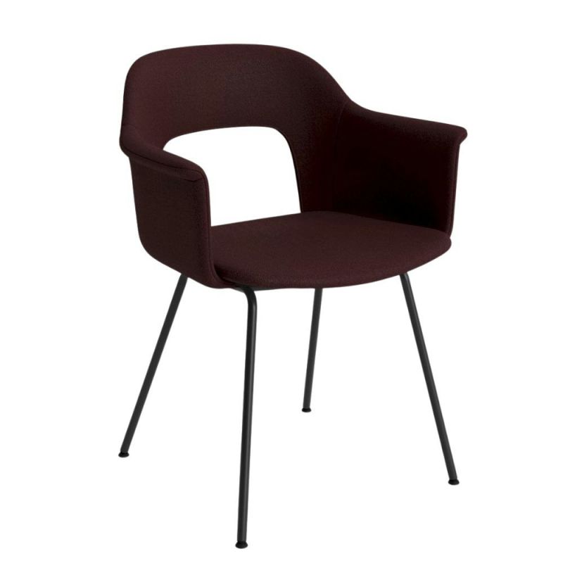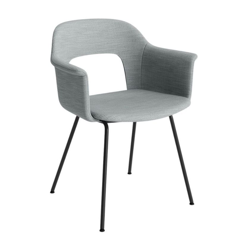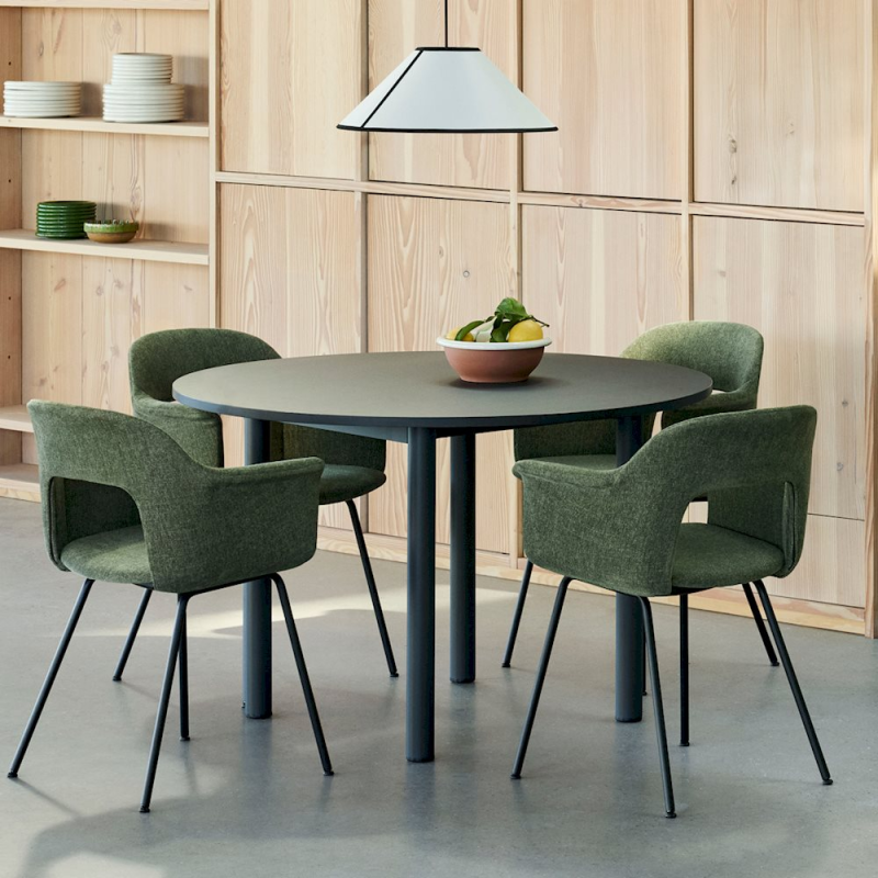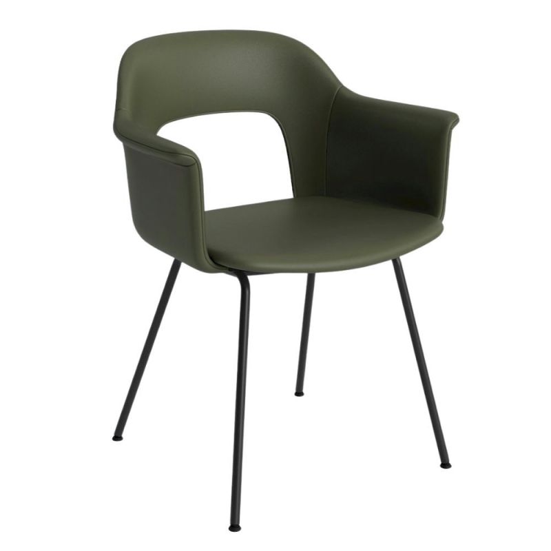 Layout Armchair 214, designet af Julien Renault med fokus på komfort, funktionalitet og bæredygtighed. Polstret sæde og ryg, karakteristisk åbning i ryglænet og slanke stålrørben for stabilitet og elegance. Skal i min. 96% genanvendt plastik, stel i krom eller pulverlakeret stål. Alle dele kan adskilles for lang levetid. Fås i flere tekstiler og olivenbladgarvet læder.