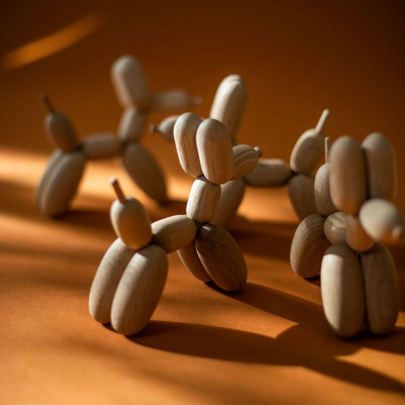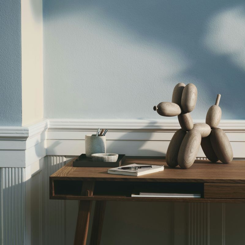 Ballon dog. En hyldest til barndommens ballonhunde her skabt i massiv, røgfarvet eg med bevægeligt hoved og hale. Et legende designobjekt, der aldrig mister pusten.
