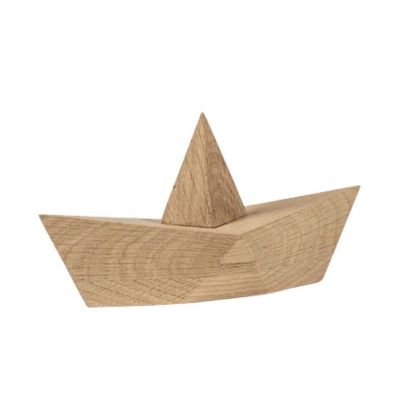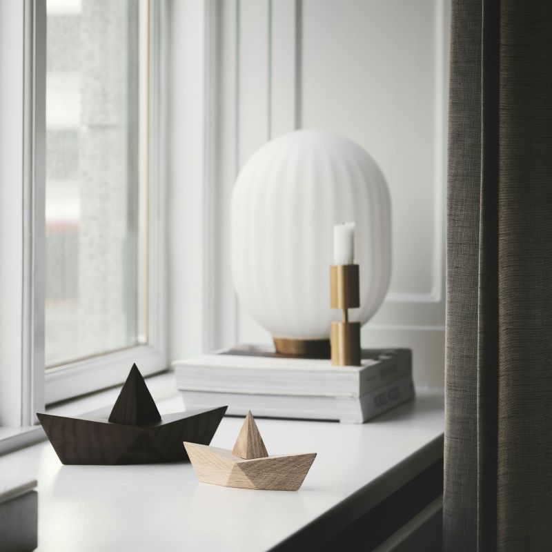 Admiral, papirbåden i træ. En hyldest til barndommens kreative papirbåde, her fortolket i massiv, røgfarvet eg. Udstyret med skjult magnet, der holder sejlet på plads et stilrent designobjekt med nostalgisk charme.