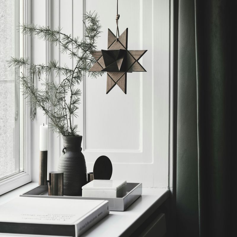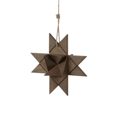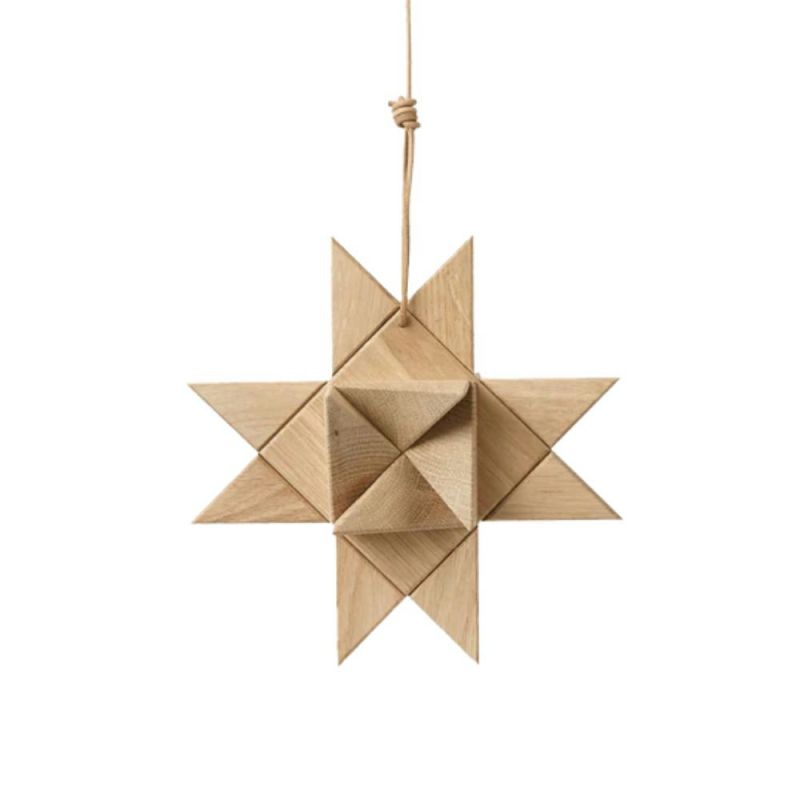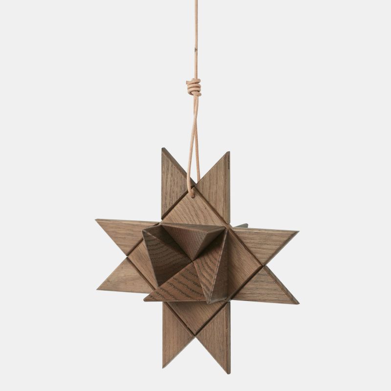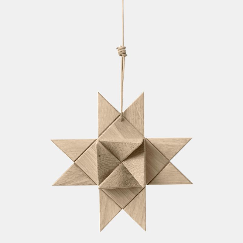 Fröbelstjernen, en klassisk juletradition genskabt i massiv eg med bløde kanter og lædersnor til ophæng. Inspireret af de flettede papirstjerner, der vækker minder om barndommens jul. Smuk alene eller i en gruppe.