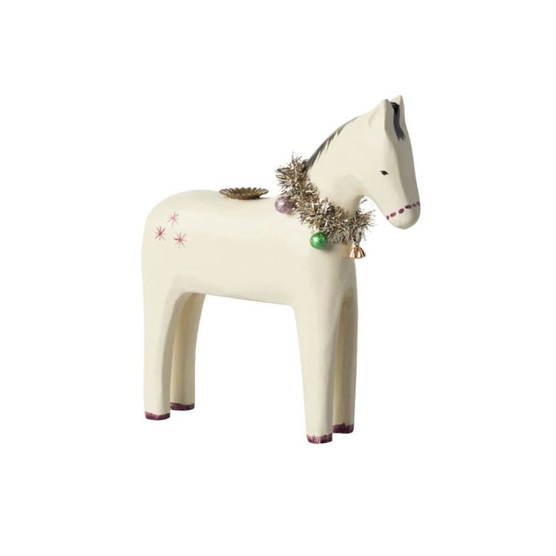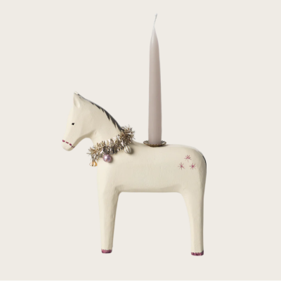 Skab en hyggelig julestemning i dit hjem med denne træhest lysestage. En gammel Maileg klassiker i en opdateret version. Stearinlys Ø2,2 cm passer perfekt til denne hest. Bemærk: Efterlad aldrig stearinlys uden opsyn.