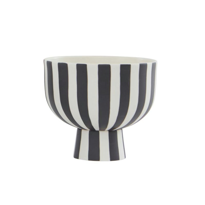 Toppu skål er kendetegnet ved et grafisk og stilrent design, der tilfører indretningen et dekorativt og moderne udtryk. Skålen kan bruges som potteskjuler, men er også fødevaregodkendt og egner sig derfor perfekt til servering af frugt og lignende. Skålen er håndlavet i 100% stentøj, hvilket giver hvert produkt et unikt præg.
