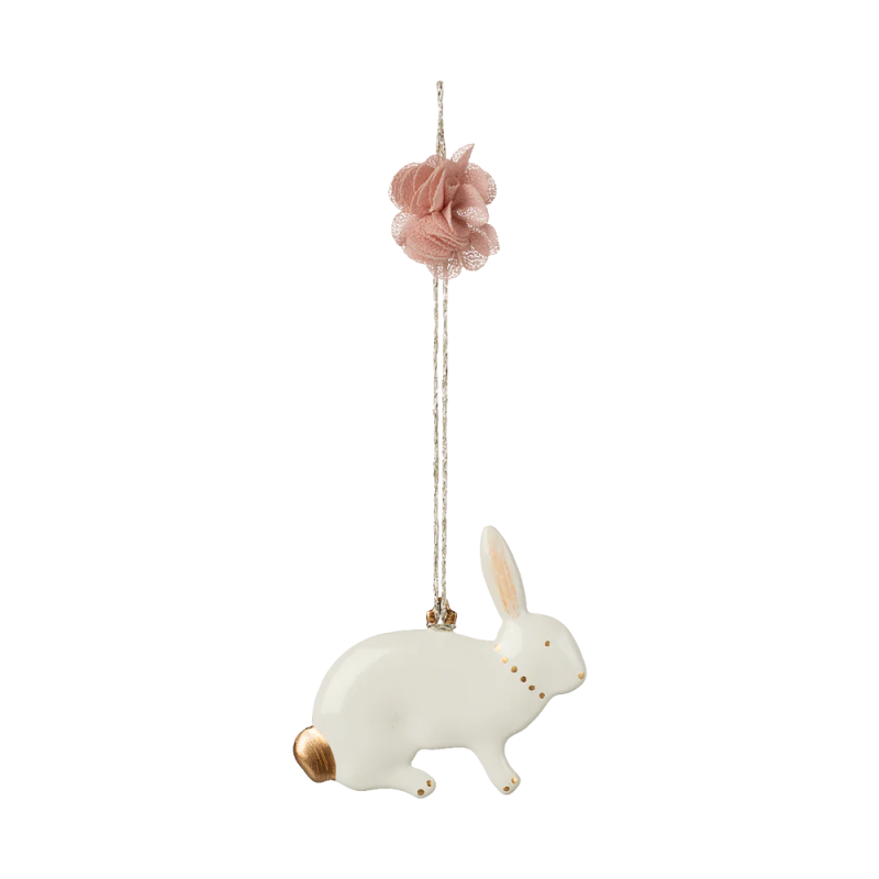 Påskehare-ornamenter i metal med håndmalede detaljer og en blød pompón på det gyldne bånd. Hæng dem smukt på en gren som pynt eller brug dem på påskebordet. Mix og udvid din samling med andre Maileg-påskeornamenter.