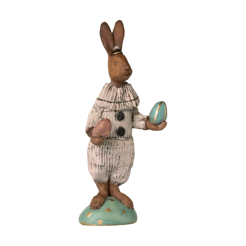 Påskefigur fra Maileg, der forestiller en hare med en kurv fyldt med æg. Figuren har blå og brune nuancer og står på en stribet base.