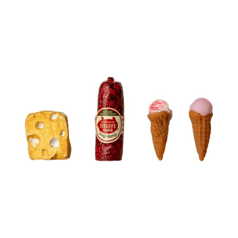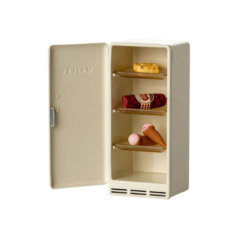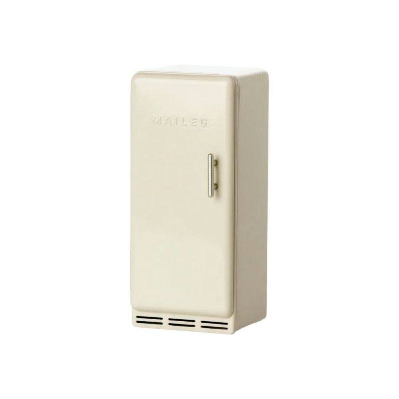 Et klassisk køleskab, der passer perfekt til Maileg Mouse hole Farmhouse. Indeholder en lille ost, pølse og is fine detaljer, der forlænger legen og giver ekstra muligheder i historiefortællingen.