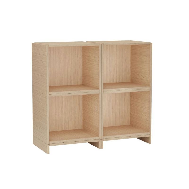 Dette er Bricks system E. Bricks er formet af fem FSC®-certificerede egetræssider, der er sammensat i forskellige niveauer, hvilket gør det muligt at stable elementerne oven pa hinanden i en selvlasende konstruktion. Det klassiske modulære opbevaringssystem består af individuelle kuber, der enten kan monteres på væggen eller placeres på en gulvsokkel. Skab en rumdeler, vægophængt bogreol eller vend kuben pa højkant som et sidebord.