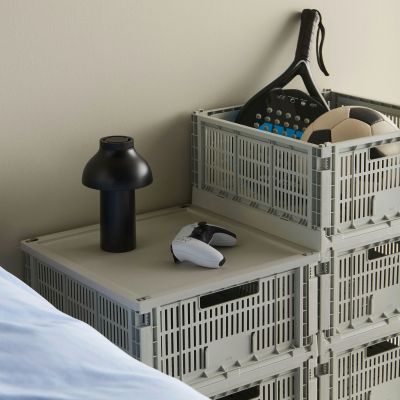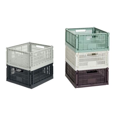 HAY Colour Crates. Praktisk og alsidig opbevaringskasse i 100% genanvendt plast. De stablebare kasser fås i flere størrelser og farver med perforeret design. Kan suppleres med låg og hjul, foldes fladt og bruges til opbevaring, display eller kreativ indretning.