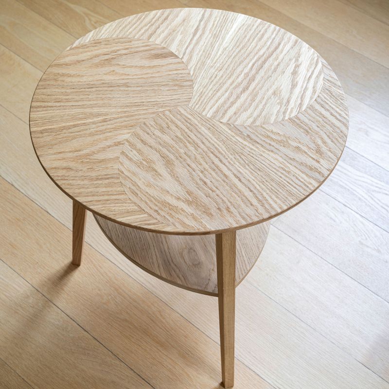 Et elegant og funktionelt bord, der bygger videre på den ikoniske Heart Table. Bordpladen er dekoreret med tre smukke dråber, der snor sig om hinanden i et harmonisk mønster, skabt med den klassiske intarsia teknik et ægte stykke håndværk med dybe rødder i tradition og kvalitet.
