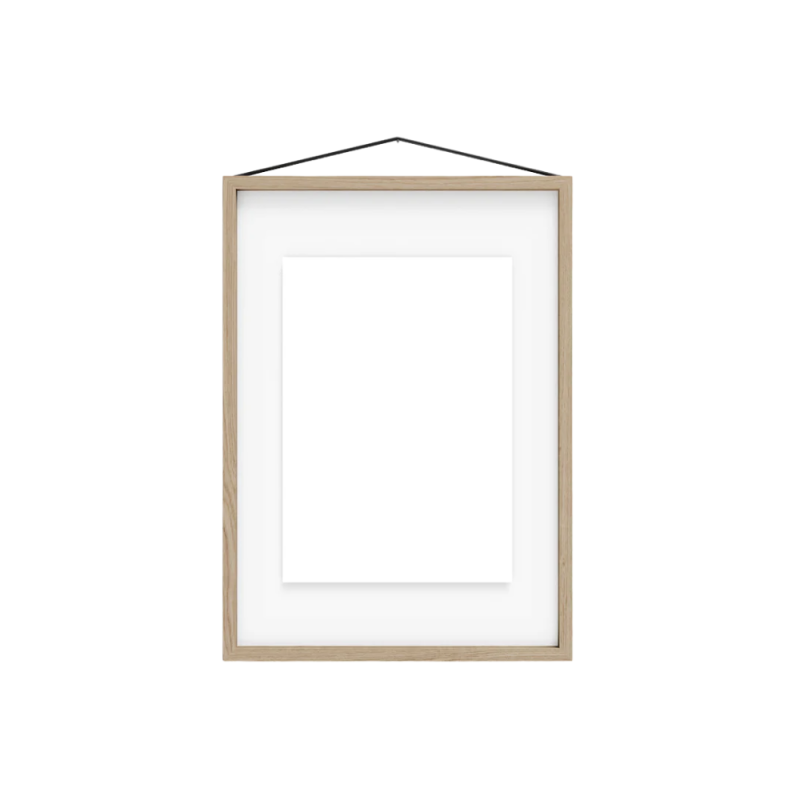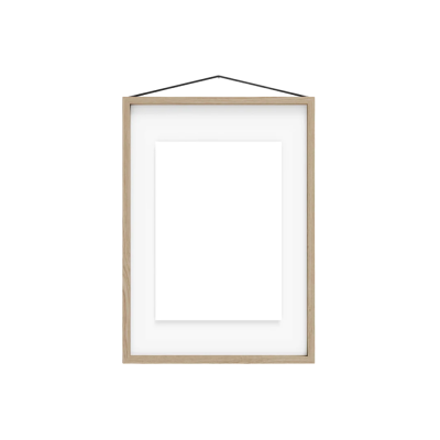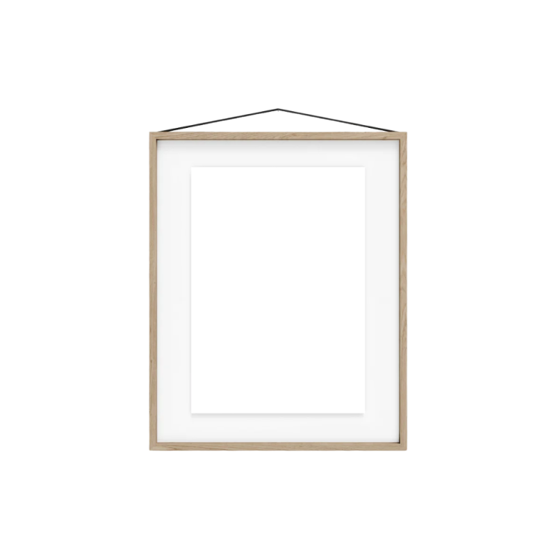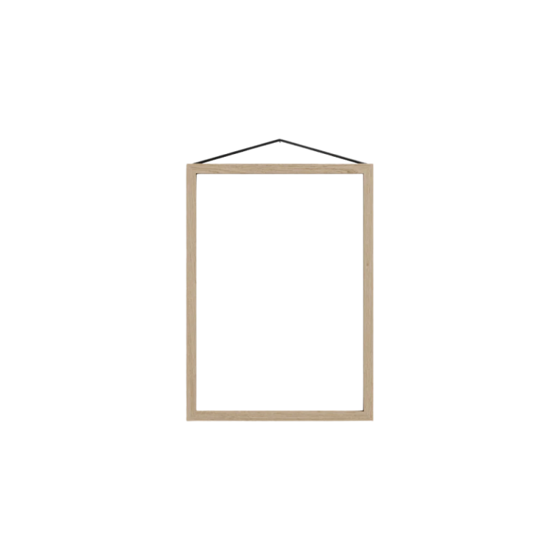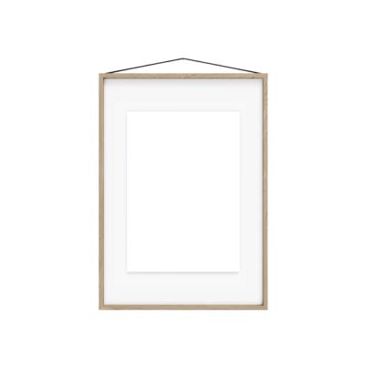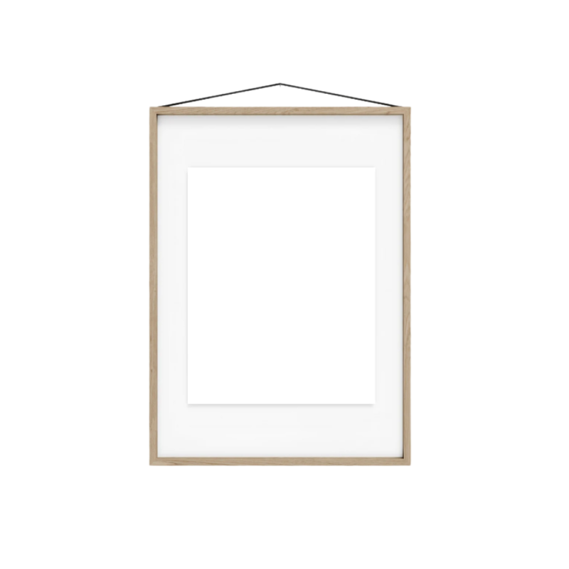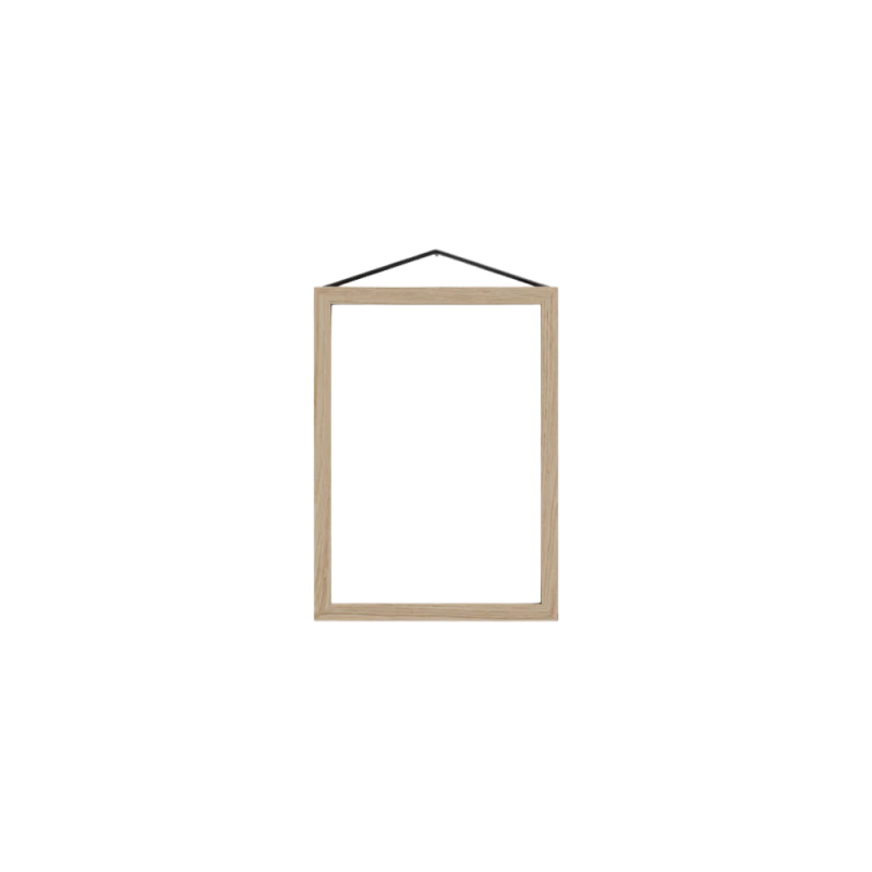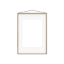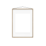 MOEBE Frame enkel og fleksibel billedramme i birketræ med transparant akrylglas og gummibånd. De to nye farver fremhæver træets naturlige årer, og gummibåndet matcher farven. Rammen kan hænges lodret eller vandret og ses fra begge sider, perfekt til billeder og kunst i alle størrelser.