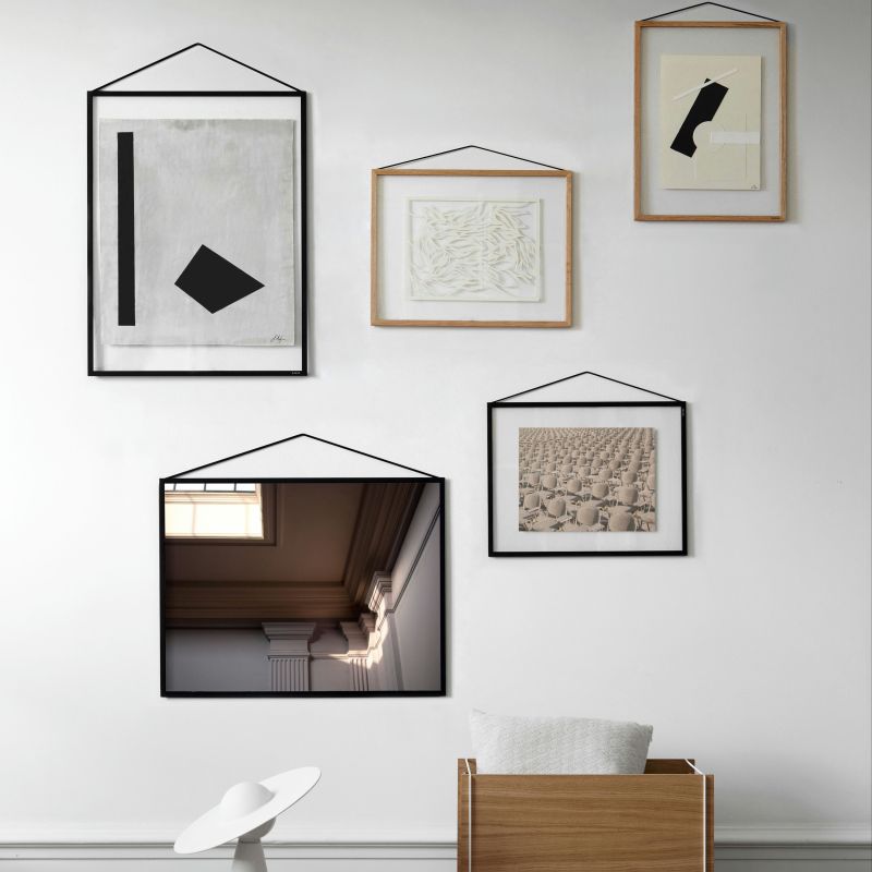 MOEBE Frame enkel og fleksibel billedramme i birketræ med transparant akrylglas og gummibånd. De to nye farver fremhæver træets naturlige årer, og gummibåndet matcher farven. Rammen kan hænges lodret eller vandret og ses fra begge sider, perfekt til billeder og kunst i alle størrelser.