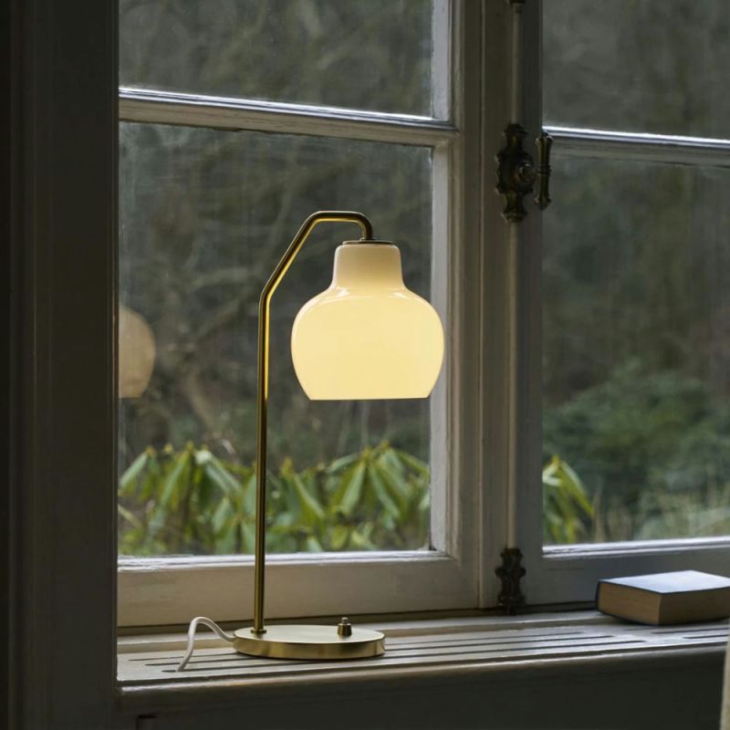 VL Ring Crown bordlampen kombinerer klassisk design med funktionel belysning. Lampen kan forudbestilles fra 1. september 2025 og sælges fra 1. oktober 2025. Den mundblæste, blanke glasskærm har en åbning i bunden, som giver et direkte, nedadrettet lys perfekt til skrivebordet, natbordet eller en hyggelig krog i stuen. Det opalhvide, trelags glas spreder lyset blødt og jævnt omkring lampen og skaber en varm, blændfri belysning med en indbydende atmosfære.