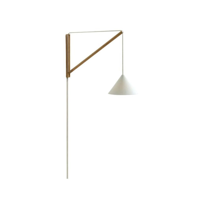 Suspended Wall Lamp er en skulpturel væglampe, der kan justeres i både højde og afstand fra væggen. Lampen består af en vægbeslag i massivt egetræ, en rustfri stålvire, en drejelig arm og en kabelskærm. Konstruktionen gør det muligt nemt at hæve, sænke eller justere lampens position. Fremstillet i EU af FSC-certificerede og EU Ecolabel-godkendte materialer.
