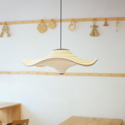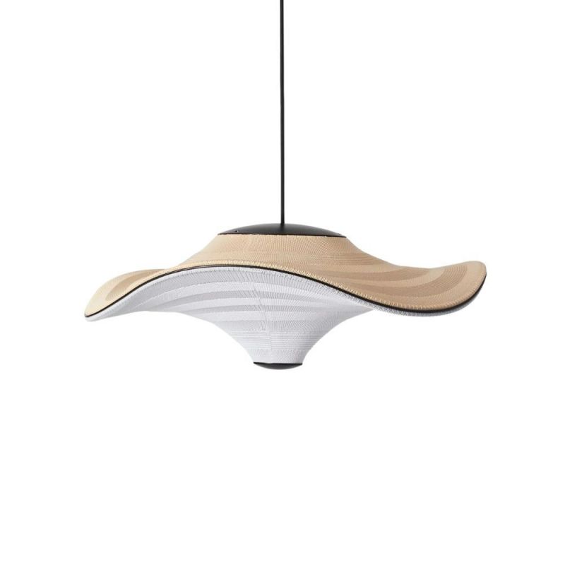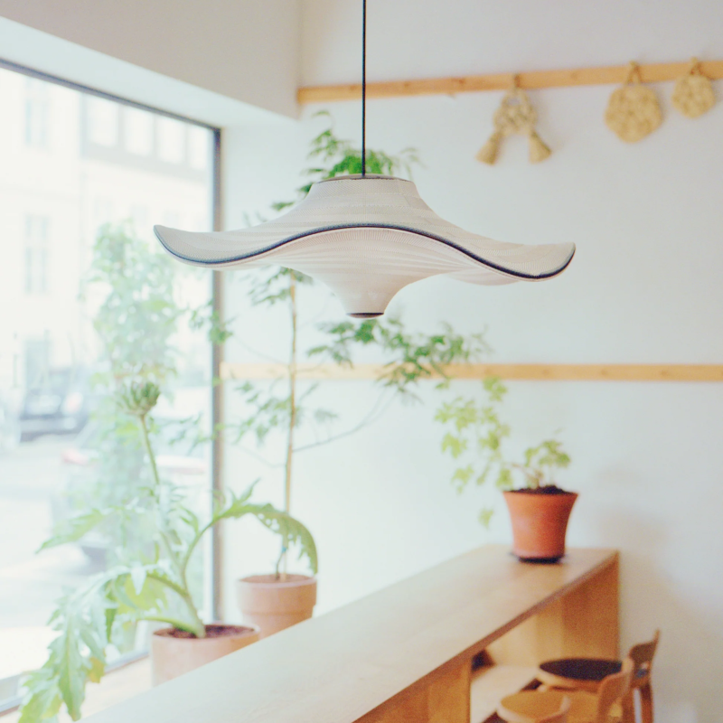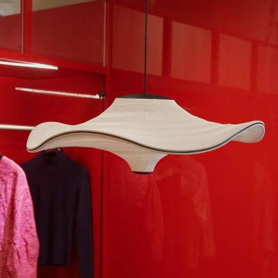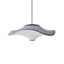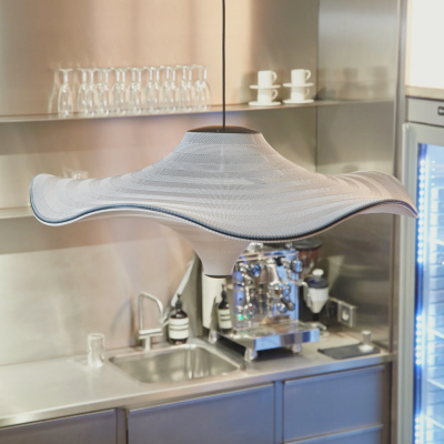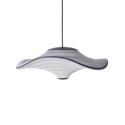 Flying is a family of sculptural pendant lamps with a soft organic shape. When suspended, they appear to float beautifully in the air. The distinctive shape of the Flying lamps is created by stretching the 3D knit material between the aluminium wavy frame and centerpiece that keeps the top and bottom apart. The LED light source is built into the top of the lamp so the light is softly diffused through the knitted bottom part of the lamp.