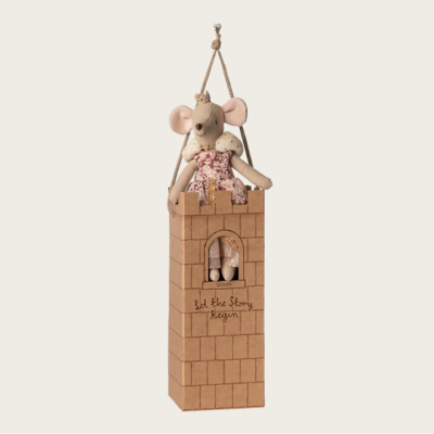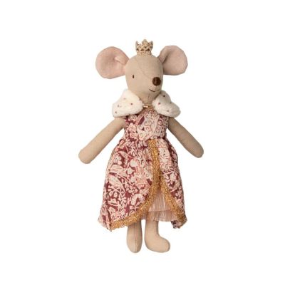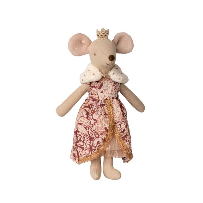 Dronningemusen i størrelse Mor er klar til at være værtinde på sit slot. Hun har en smuk kongelig kjole og krone på og passer perfekt ind i slotssalen.