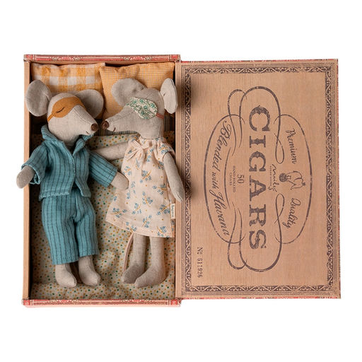 Mor og Far mus fra Maileg er klar til natten i deres fine nattøj og sovemasker. Cigaræsken er en hyggelig seng, der sikrer søde drømme. Med varierende sengetøjsfarver bliver hvert sæt unikt og charmerende.