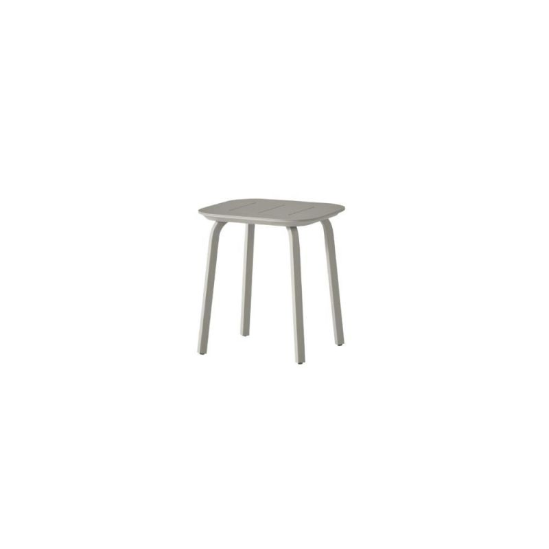 Bordpladen i aluminium er fremstillet til at modstå udendørs forhold. En karakteristisk trekantet kant tilfører volumen til det rene udtryk, mens riller sikrer, at regnvand let ledes væk fra overfladen. Justerbare glidere på hvert ben gør det nemt at tilpasse bordet til underlaget. Benene er elektrogalvaniserede og pulverlakerede, hvilket sikrer styrke og langvarig stabilitet.