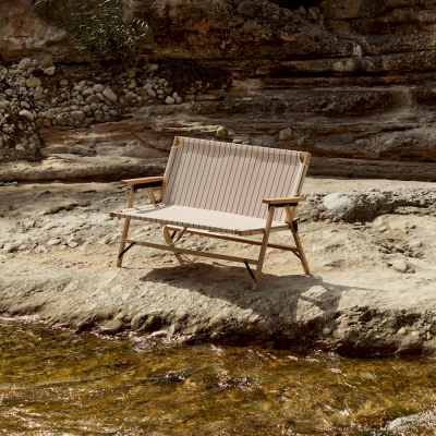 Outdoor Market Foldbar Sofa er en del af HAY Outdoor Market Shop af Jasper Morrison. Sofaen har en let bøgetræskonstruktion og sæde i stribet, genanvendt polyester. Med håndtag på både sæde og ryg er den nem at transportere, og leveres med en matchende stofpose til opbevaring. Fås i flere farver perfekt til afslapning udendørs, hvor som helst.
