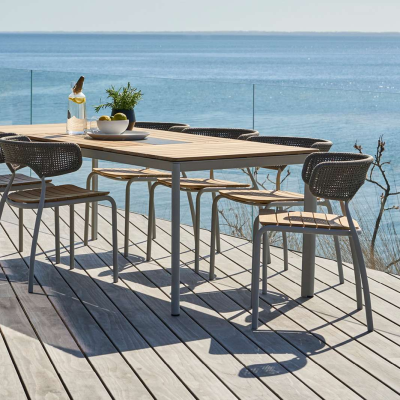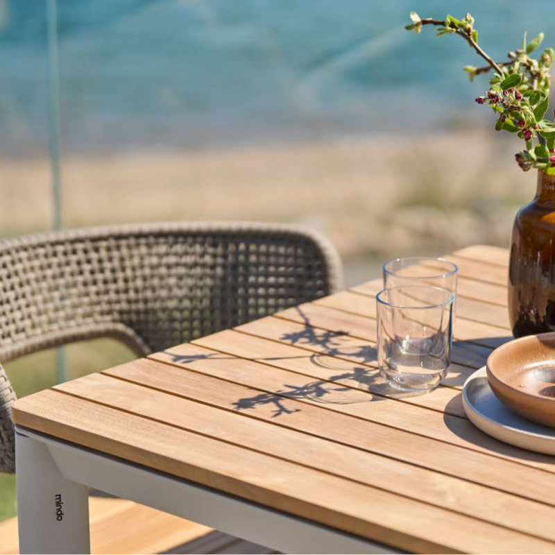 Mindo 101 spisebord forener stil og funktionalitet med sin elegante aluminiumsramme. Bordet fås med enten en keramisk eller teak-bordplade, og er designet til at maksimere siddepladsen med tre stole på hver side. Keramik er både stærkt og vedligeholdelsesvenligt, hvilket gør det ideelt til det danske klima. Teakpladen er ubehandlet og vil med tiden udvikle en smuk patina, der tilføjer ekstra charme og karakter.