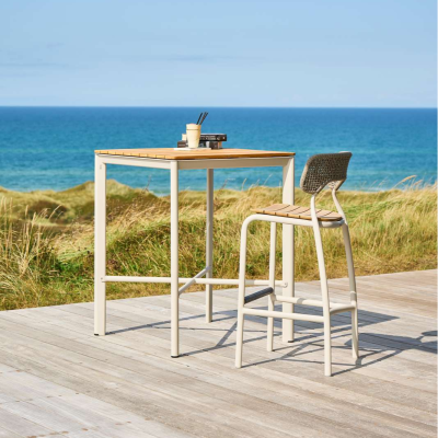 Mindo 102 Barbord er designet med en robust aluminiumsramme og er ideelt til kommercielle rum som hoteller og restauranter. Bordet fås med enten en HPL- eller teak-bordplade, og kombinerer holdbarhed med stil for at imødekomme både funktionelle og æstetiske behov.