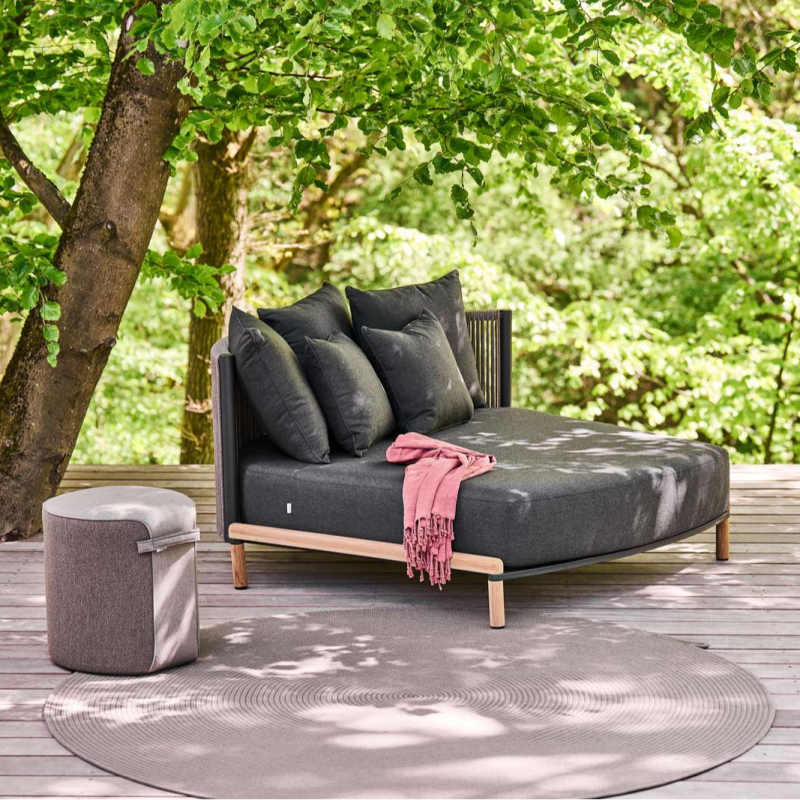 Mindo 107 Daybed inviterer til ren afslapning med sine organiske former, bløde, uldlignende reb og indbydende hynder. De løse rygpuder kan nemt arrangeres for optimal komfort, hvilket skaber et idyllisk og personligt loungeområde, perfekt til afslapning.