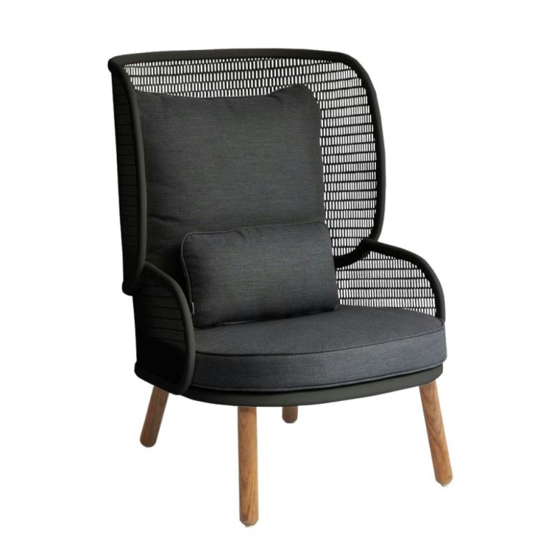 Mindo 118 Lounge Chair tilbyder komfort og en unik æstetik med sit høje ryglæn og luftige design. Den buede ryg og de bløde puder står i flot kontrast til de robuste teakben, hvilket skaber en skulpturel og indbydende siddeplads.