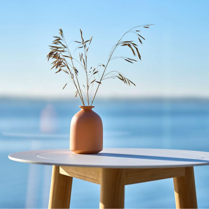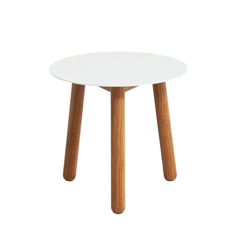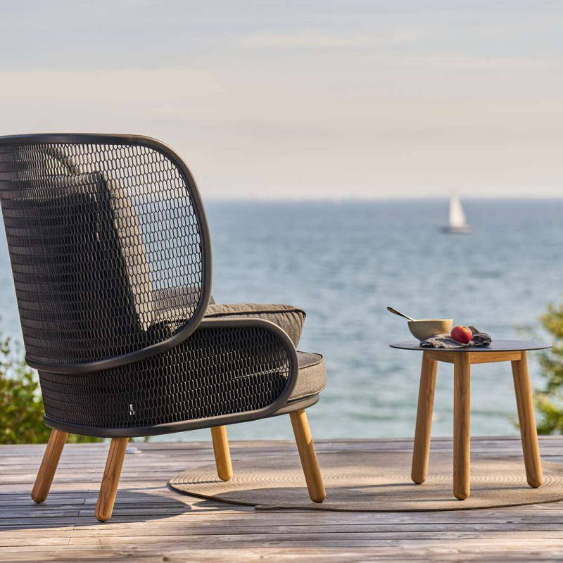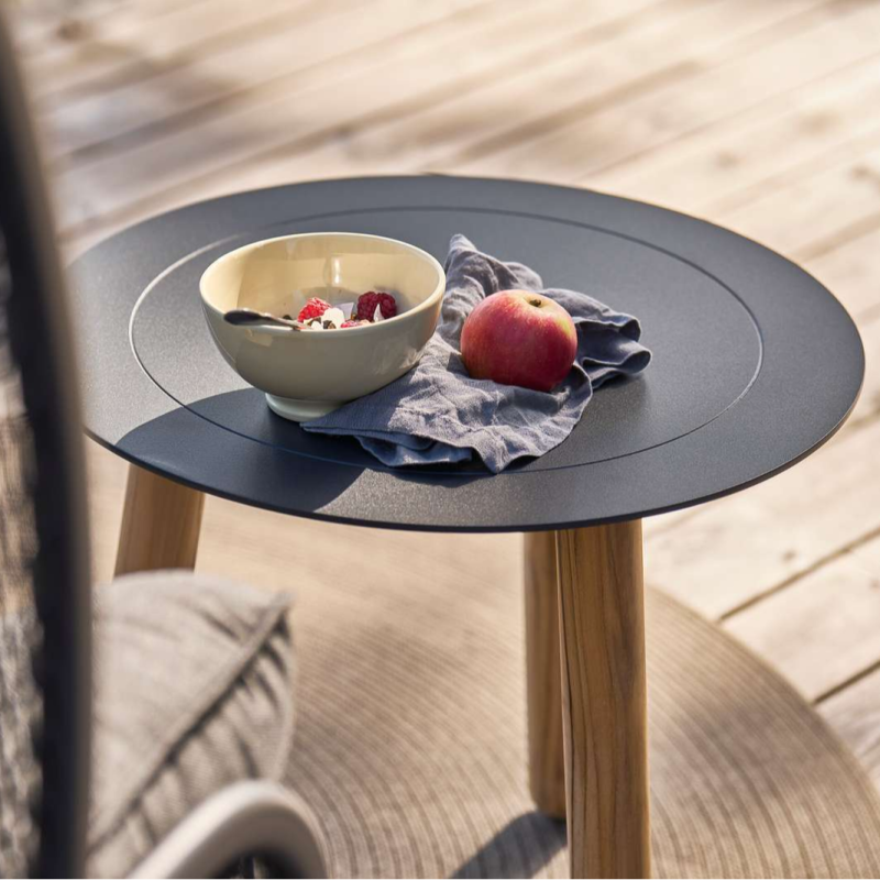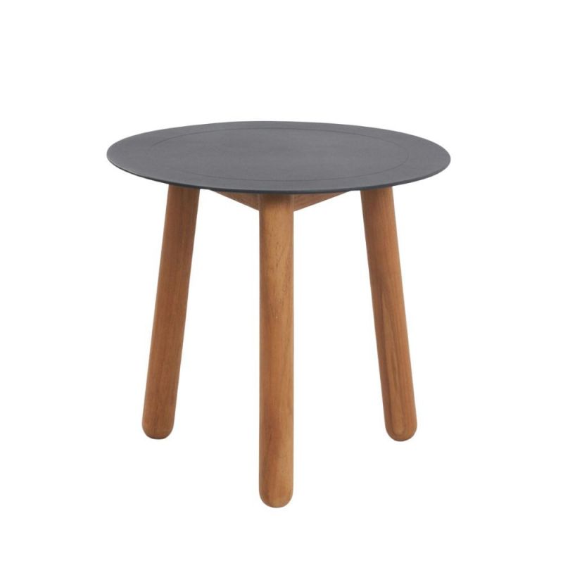 Mindo 118 Sidebord er et elegant møbel med en tynd aluminiumsplade og robuste teak-ben. Designet komplementerer perfekt loungestolen i samme serie, og den enkle, raffinerede stil passer ind i en række udendørs omgivelser.