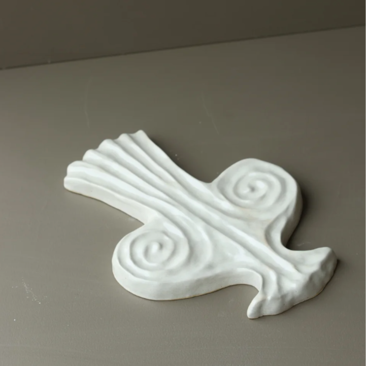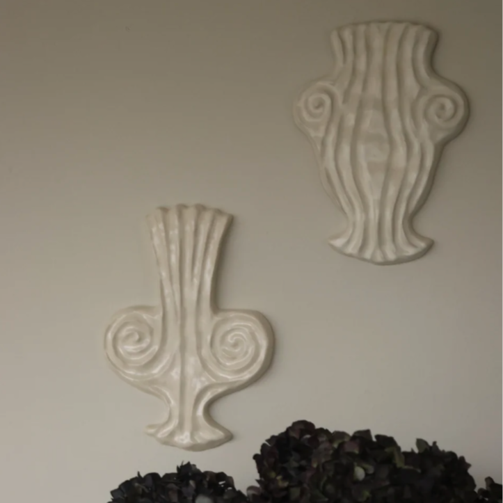 Thalia, komediens muse, knyttes i mytologien til munterhed, lethed og livsbekræftende energi. I denne kunstneriske fortolkning står hun som et billede på det legende sind og den kraft, der ligger i humorens evne til at løfte stemningen. Fortællingen om musen og objektets udformning er tænkt som en helhed: inspirationen får en visuel struktur, mens materialet giver idéen en sanselig og håndgribelig tilstedeværelse. Hvert værk fremstilles individuelt i stentøj med glasur i afdæmpede, varme hvidtoner med et let patineret præg og er udformet til at indgå som et markant element på væggen. Muserne er alle glaserede i Antique White.