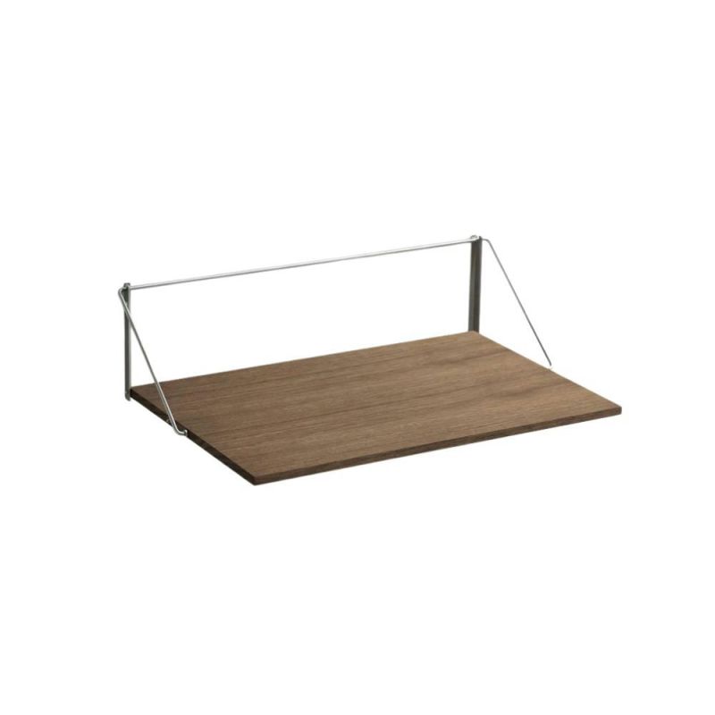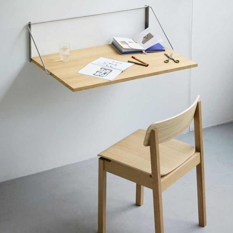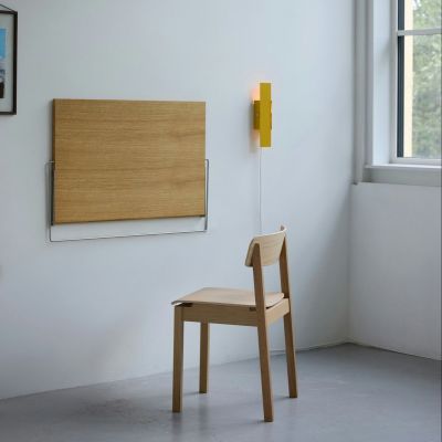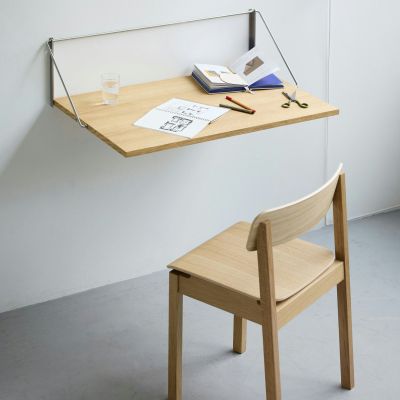 Fold-out Desk er et vægmonteret skrivebord, der kan foldes væk på få sekunder. Det består af blot tre dele: to slanke metalbeslag, en bordplade, der klikkes på plads, og en støttewire i rustfrit stål. Når bordet er slået ud, skaber det en stabil arbejdsplads, og når det ikke er i brug, foldes det op til en elegant lodret linje, hvor kun de diskrete beslag er synlige. Fremstillet i EU af FSC-certificerede og EU Ecolabel-godkendte materialer.