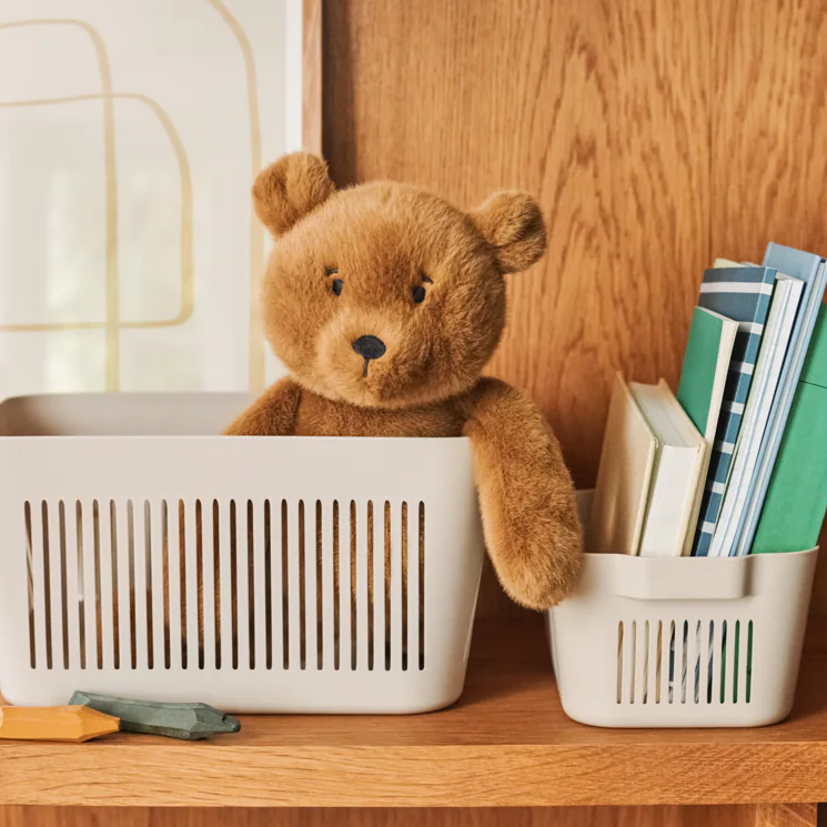 MAKEEVA-kurvene er en ideel løsning til åben og lettilgængelig opbevaring. Kurvene kan stables, når de er tomme, og kan nemt passe ind i et skab eller stå fremme på åbne hylder på børnenes værelse. Det enkle design egner sig godt til tøj, legetøj og meget mere og har håndtag, der gør dem nemme at flytte rundt på for både store og små familiemedlemmer.