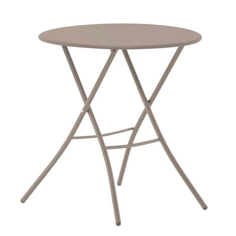 Rundt og foldbart udendørsbord, der er pladsbesparende og nemt at opbevare. Stel i stål med en højde på 70 cm. Fås i flere forskellige farver.