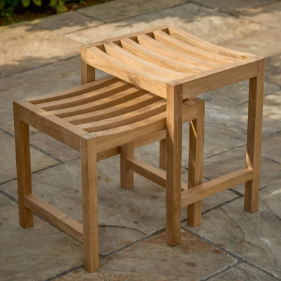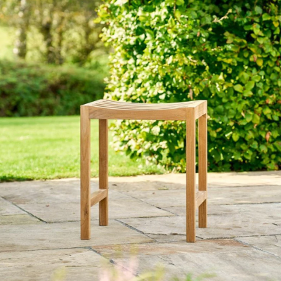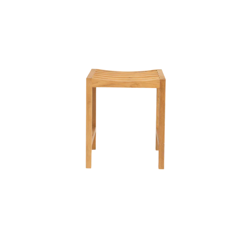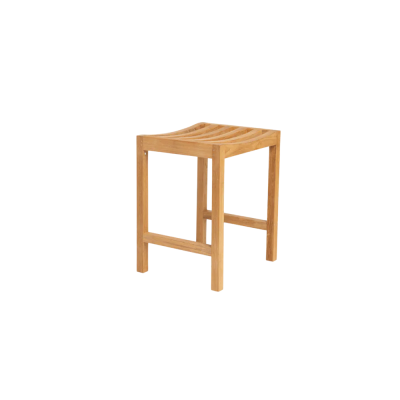 Komfortabelt arbejdsskammel med buet sæde i holdbart teaktræ.