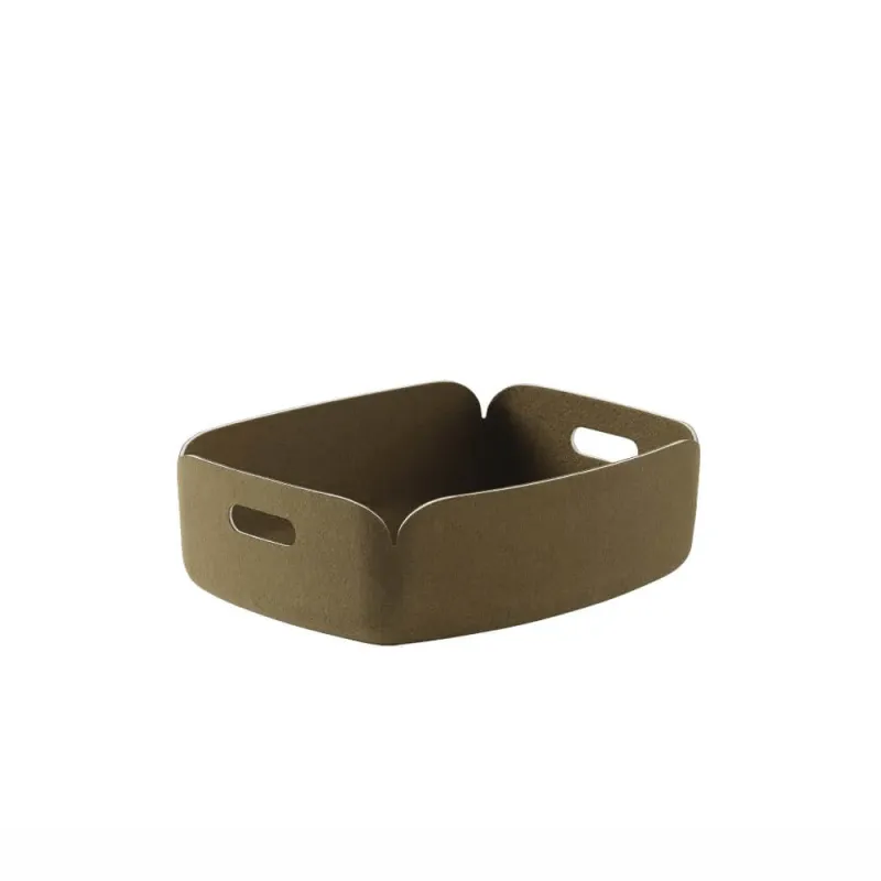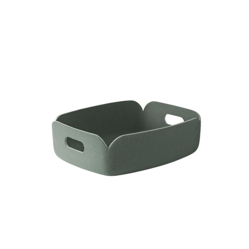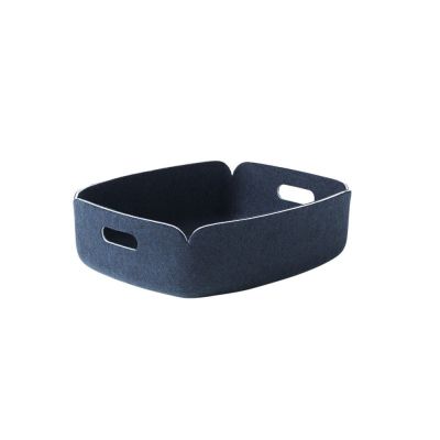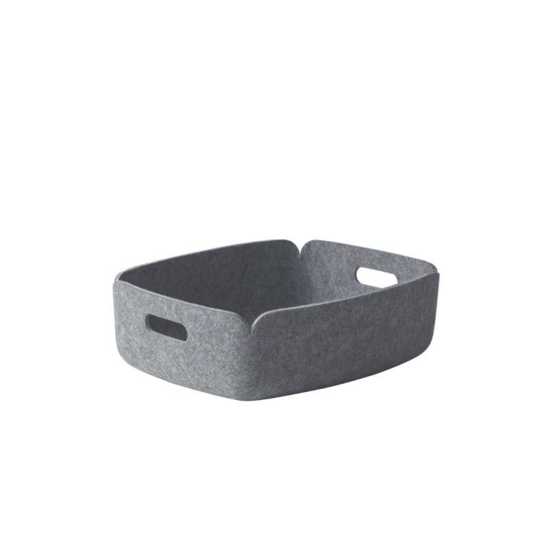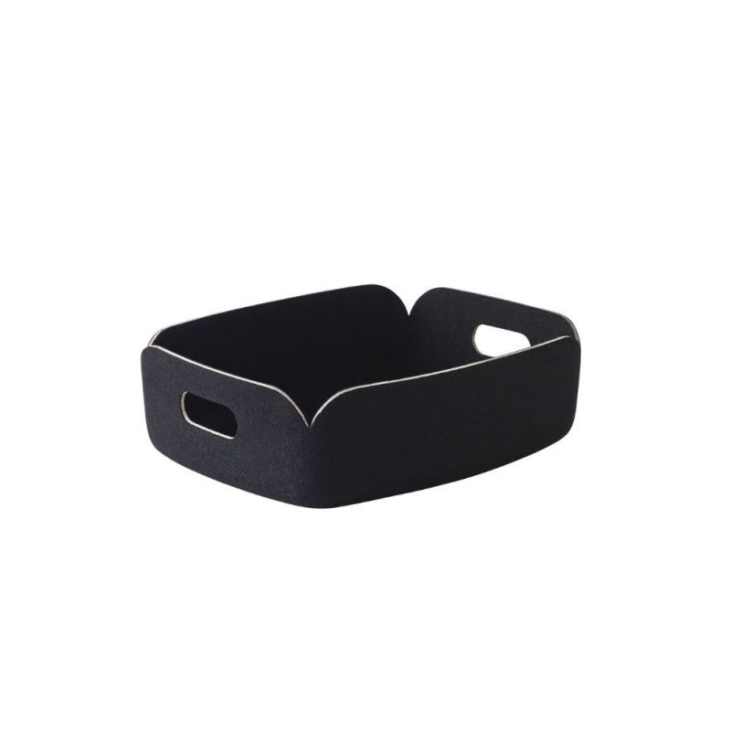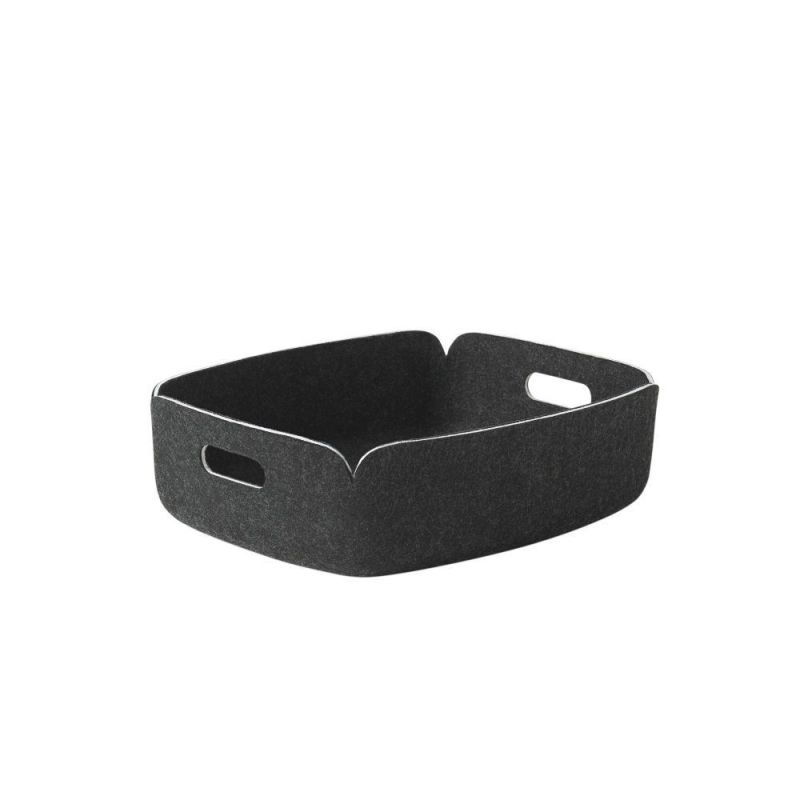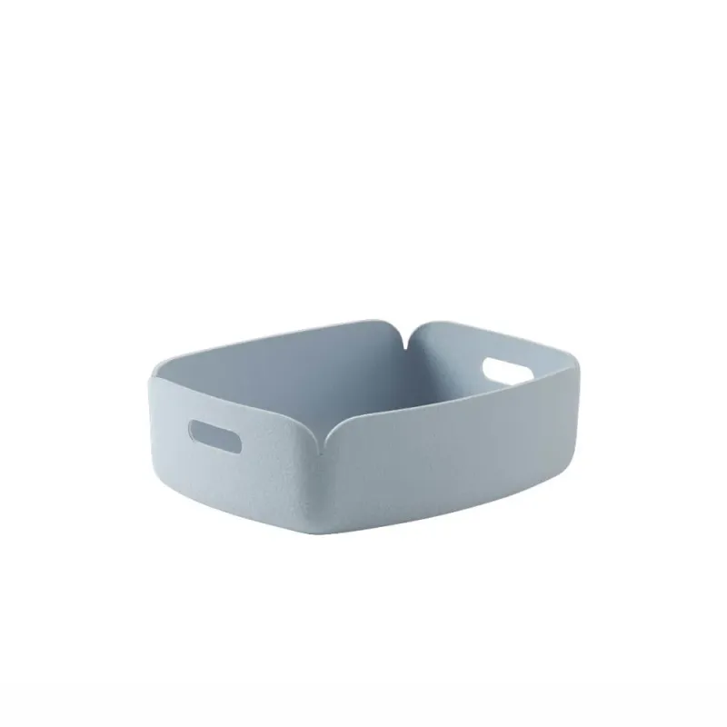 Restore-bakken giver moderne opbevaring et nyt udtryk. Den er lavet af fibre fra 100 % genanvendt plast og fås i flere farver og to størrelser. Den store bakke er ideel til dokumenter, redskaber eller legetøj, mens den flade version organiserer mindre ting som penne og notesbøger.