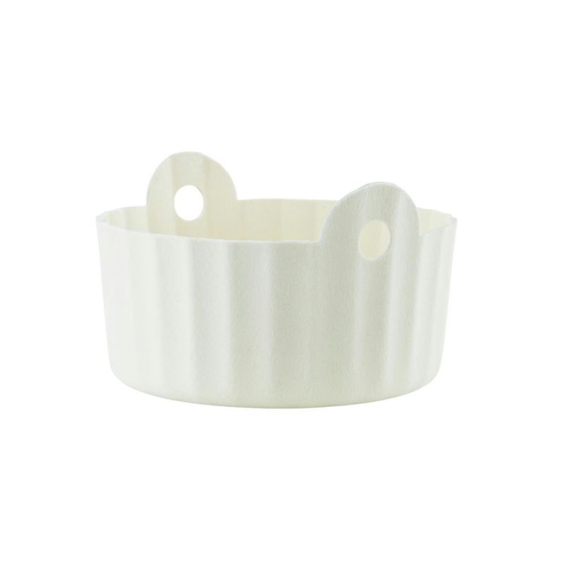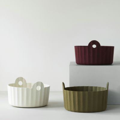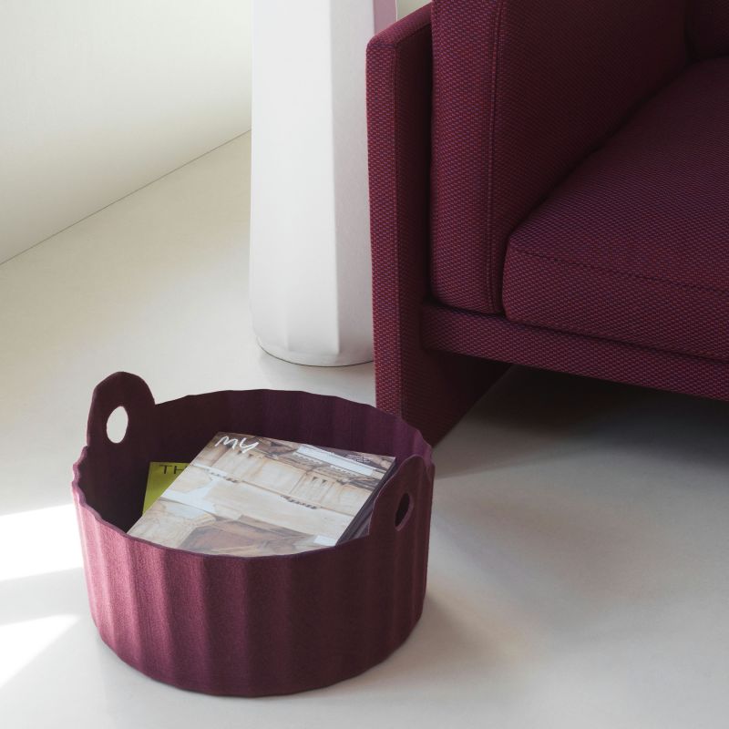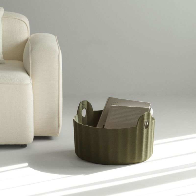Colu Basket, designet af belgiske Baptiste Vandaele, forener funktionalitet med et elegant udtryk. Fremstillet i blødt, men slidstærkt filt af genanvendt PET fra plastflasker, er kurven både let og praktisk. De integrerede håndtag gør den ideel til opbevaring af alt fra magasiner og legetøj til daglige nødvendigheder.