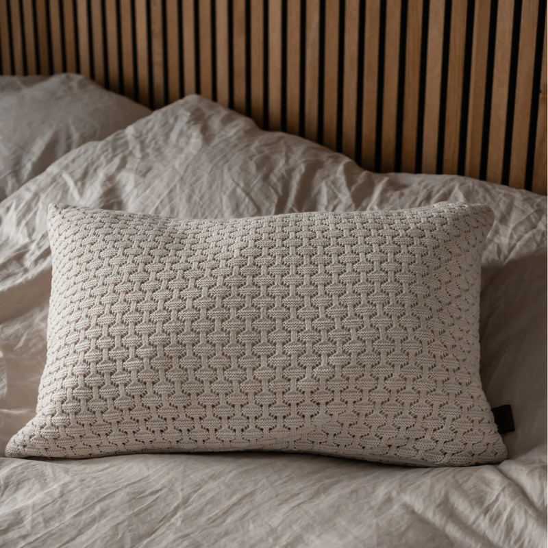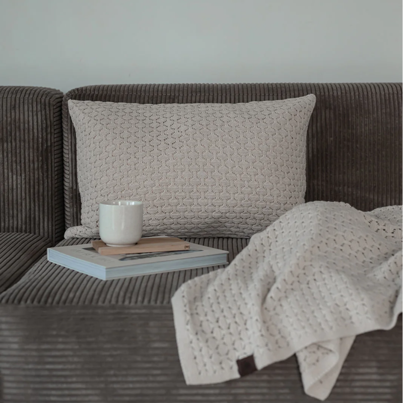 Til dem, der elsker hjemlig hygge! Kender du en, der elsker hjemlig hygge? Strikket pudebetræk i smukt og let hul mønster. Monteringspuden har 100% andefjern og kan vaskes og tumbles. Perfekt i sofaen sammen med plaiden, så er du klar til de kolde aftener. Smukt og dekorativt interiørtekstil.