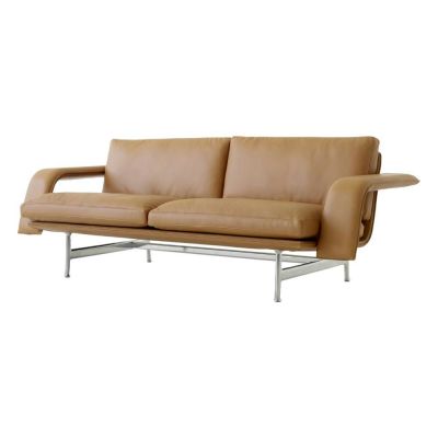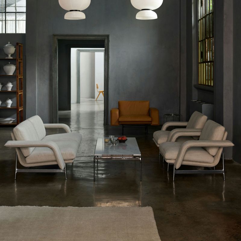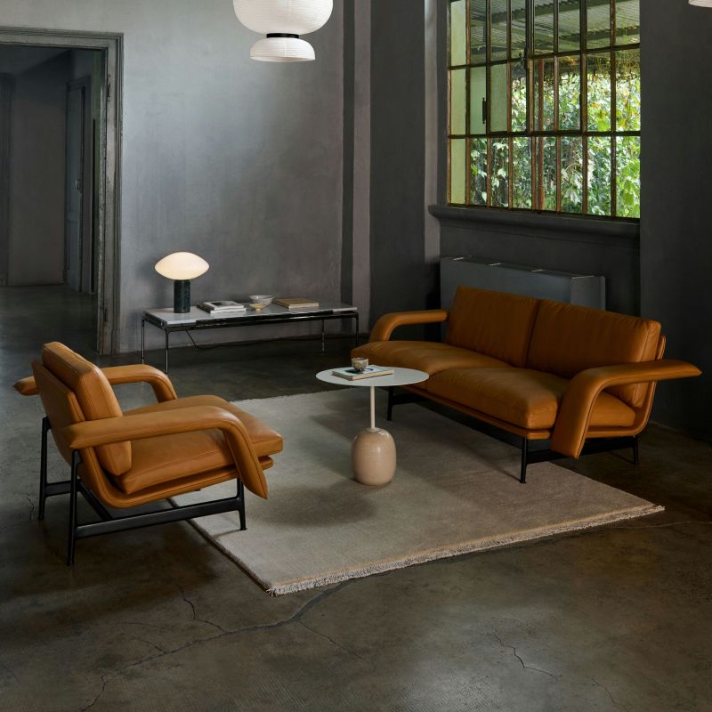 Meantime-sofaen, designet af Anderssen & Voll, forener en karakterfuld silhuet med indbydende komfort. De brede, slanke armlæn strækker sig fremad og vækker minder om møbler i overgangsrum som ventesale. Med velafbalancerede proportioner opnås en visuel lethed, der kombinerer stærkt design med en støttende og behagelig siddeoplevelse.