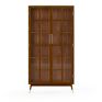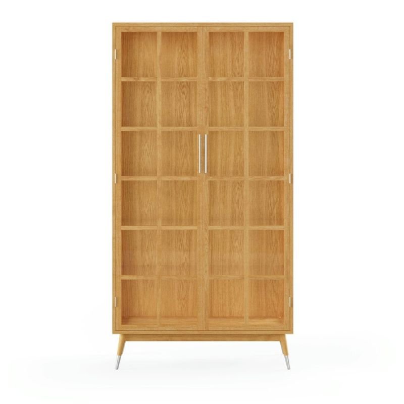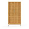 Det fint forarbejdet massive træ med de dekorative ben af børstet stål og det klare glas på siderne og fronten, giver vitrinen et let og elegant udtryk