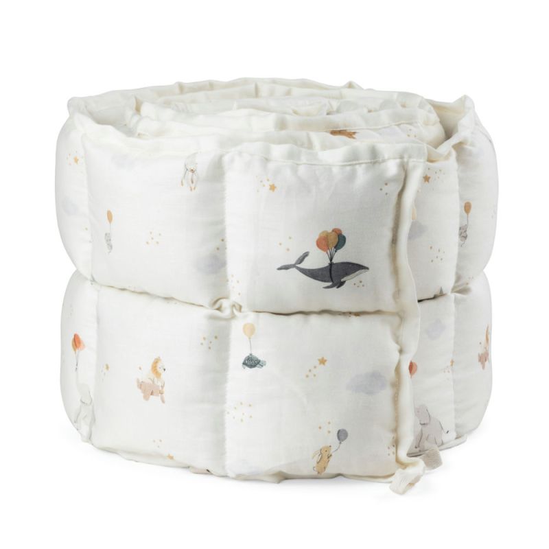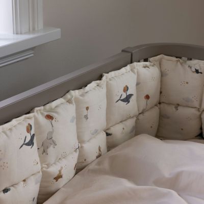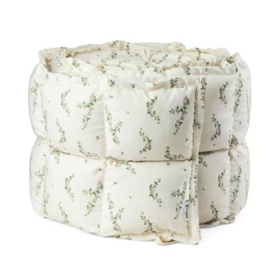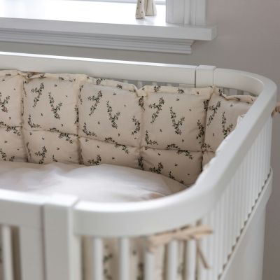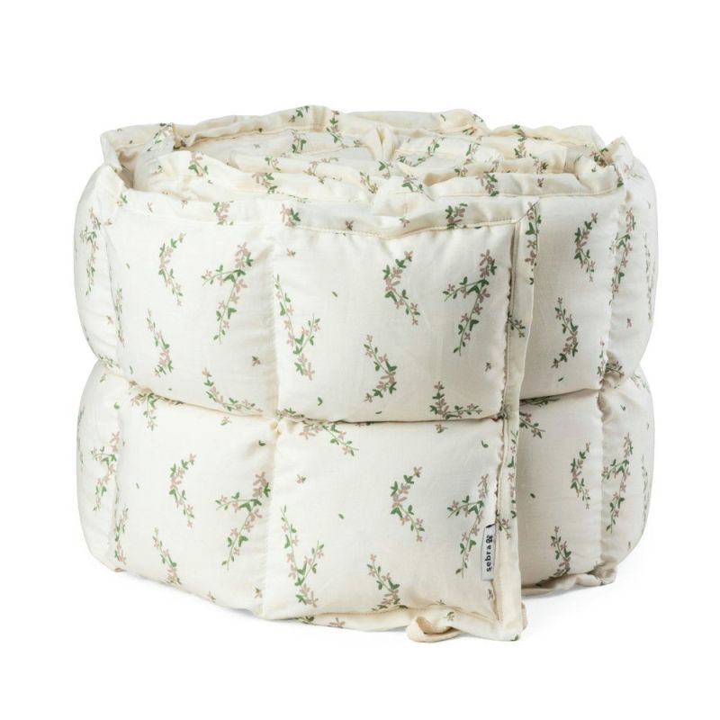Lækker, tyk sengerand af allergivenlig kapokfyld og certificeret, økologisk bomuld. Indret babysengen med en sengerand, der beskytter dit barn mod sengens kanter og sørger for, at sutten ikke falder ud. Kapoksengeranden passer til Sebra Sengen, Baby & Jr., med bundpladen i øverste position og til en standard barneseng på 60 x 120 cm. Du kan tilpasse sengeranden til en mindre seng ved at lade den overlappe, f.eks. i fodenden. De fine bindebånd giver dig mulighed for at binde den fast til tremmesengen både oppe og nede.