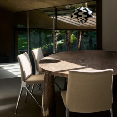 Kape Chair fra &Tradition, designet af Industrial Facility, er en grafisk markant stol med fokus på funktion og bæredygtighed gennem sit udskiftelige polstersystem. Stolens karakter skabes af det fritstående, cantileverede sæde, der spejler ryggen, så det polstrede betræk nemt kan tages af og på som en sok.