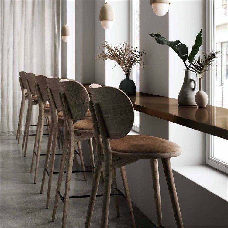 Barstolen med ryglæn fra Mater er endnu et gennemført og stilfuldt design, med høj komfort og sans for detaljen. Barstolen er fremstillet af solid eg eller solid bøg med læder polstret sæde, hvilket giver et smukt udtryk og fås i flere forskellige varianter.