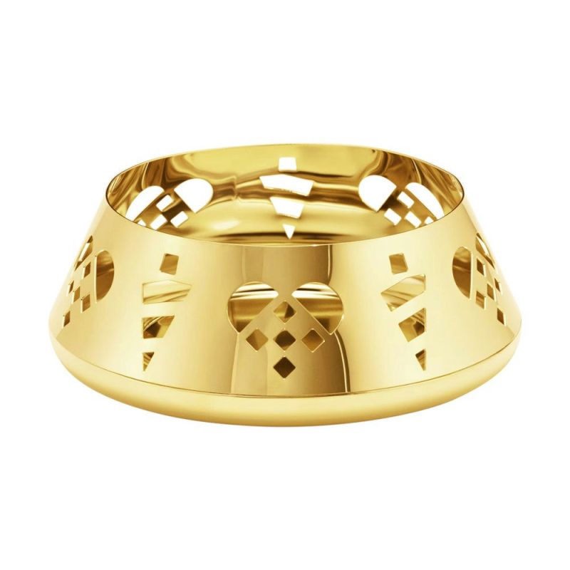 Denne funklende stage, belagt med 18 karat guld, passer perfekt til bloklys og fremhæver elegant den varme glød fra det levende lys. Designet er inspireret af klassiske danske julemotiver, og lysestagen har smukke udskæringer af flettede julehjerter og kræmmerhuse, som skaber en hyggelig stemning i dit hjem.