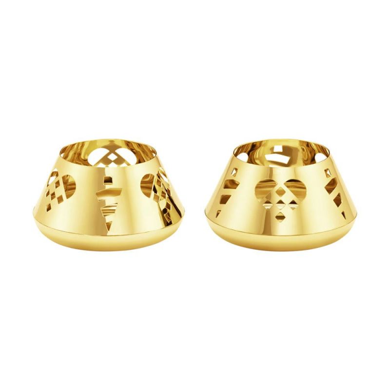 Dette sæt med to funklende fyrfadsstager, belagt med 18 karat guld, fremhæver gløden fra de levende lys på smukkeste vis. Designet er inspireret af klassiske danske julemotiver, og fyrfadsstagerne har fine udskæringer af flettede julehjerter og kræmmerhuse, som skaber en hyggelig stemning i dit hjem.