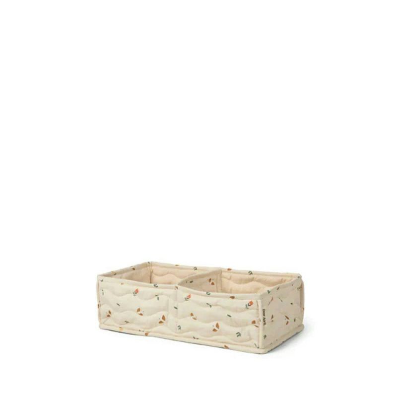 Charmerende opbevaringskurv i fint bølgequilt med praktiske rum, der passer perfekt på puslebordet sammen med Dear Aprils puslepude, eller som skuffeorganiser til at holde orden på tøj, bleer osv. til baby.