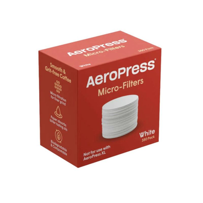 Mikrofiltre til AeroPress Original, Go og Clear. Filtrene fanger effektivt grums og giver en ensartet, ren og klar kop kaffe hver gang. Pakken indeholder 350 stk.