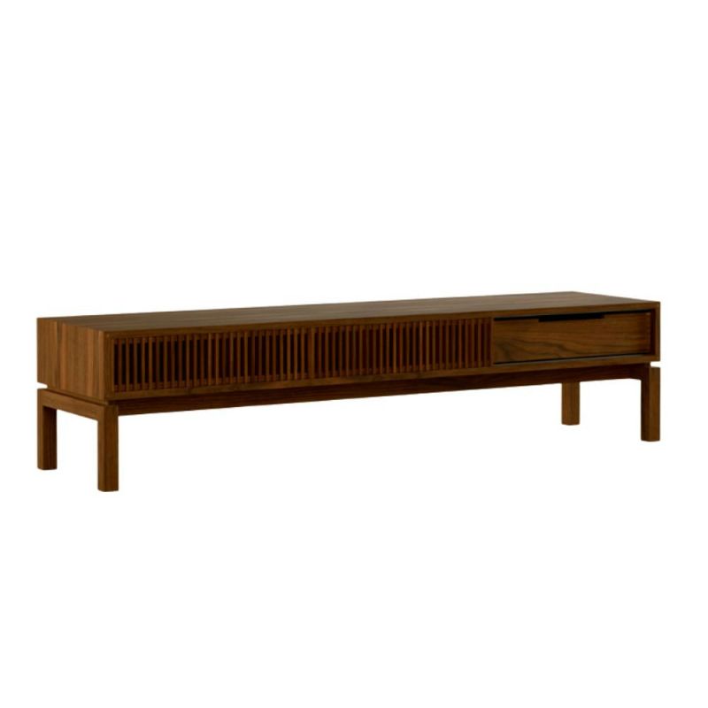 TV-bord AK 2020 forener stilrent design og praktisk funktion. Skydelåger med audiotekstil gør det muligt at betjene enheder med fjernbetjening, mens kabler og elektronik skjules elegant bag det enkle udtryk. Den massive træsokkel løfter skærmen i optimal højde og gør møblet let at flytte, så du nemt kan tilpasse indretningen.