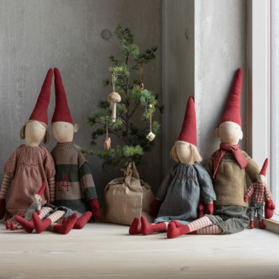Denne nissepige i størrelse small er iført en smuk kjole med broderi og smock detaljer.