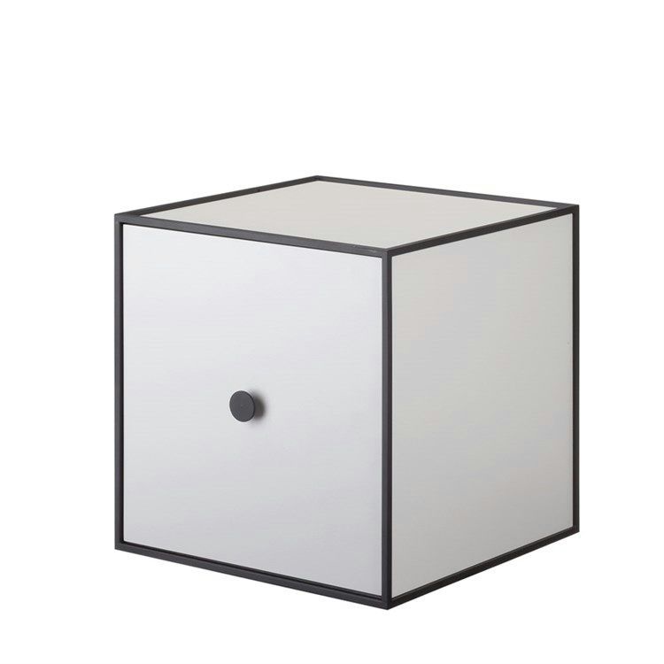 Reol kasserne Frame fra Audo er designet af Mogens Lassen, som har skabt et unikt og eksklusivt reolsystem, som kan individualiseres på mange forskellige måder. Kasserne her fås med monteret låge med metalgreb, så man kan bruge reol modulet som et lille skab i både stue, kontor eller i entreen.